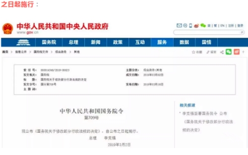2019年3月18日,国务院发布《关于修改部分行政法规的决定》,其中包括《中华人民共和国药品管理法实施条例》、《化妆品卫生监督条例》、《艾滋病防治条例》等的修订决定,并自公布之日起施行: